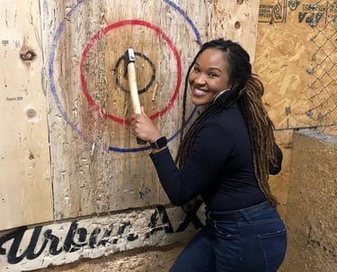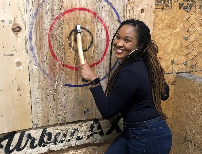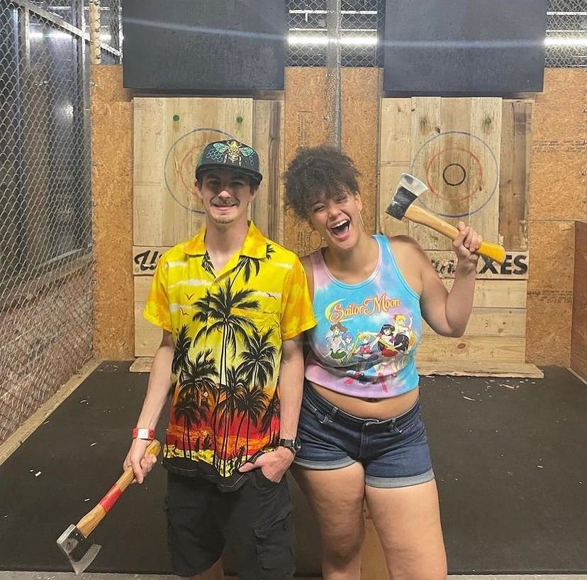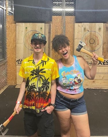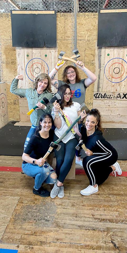 Snapshots of friends throwing axes and sharing laughs.